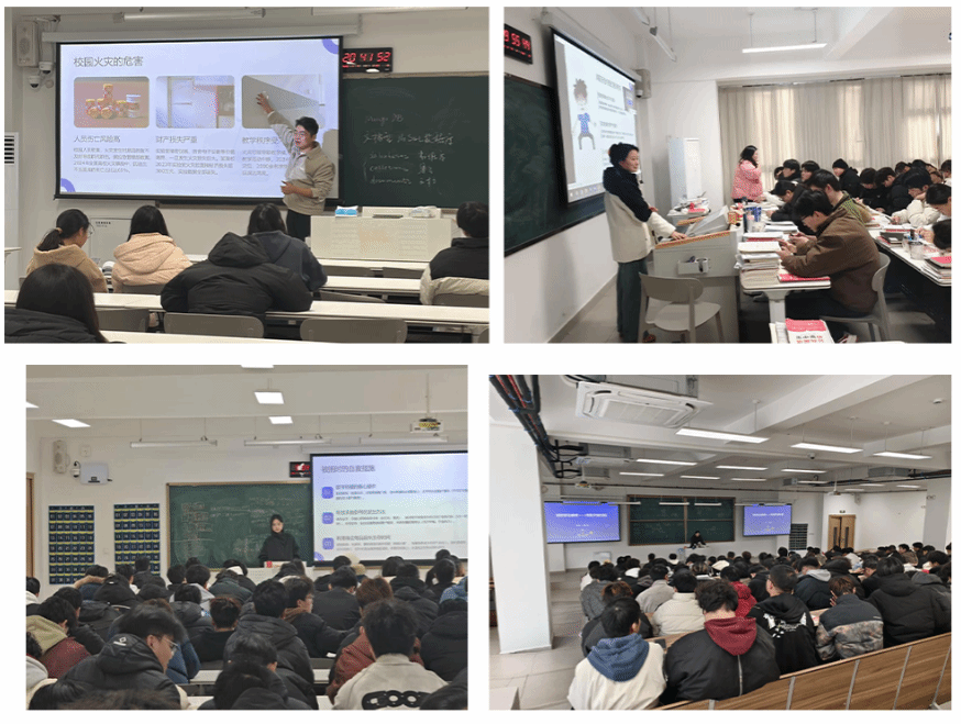 班会筹备阶段,学院学生工作办公室统一制定班会指导方案,明确“知识普及+案例警示+实践操作”三维教学目标,为各班提供了包含火灾事故案例汇编、消防器材使用视频、逃生自救指南等在内的标准化学习资料。班会开展过程中,各班辅导员结合专业特色与校园实际,采用“理论讲解+互动体验”的形式,让消防安全知识入脑入心。在知识普及环节,重点围绕火灾成因分类(电气火灾、易燃物火灾等)、校园重点防火区域(宿舍、实验室、教学楼、食堂)的安全规范展开讲解,详细拆解了宿舍违规使用大功率电器、实验室违规操作仪器、楼道堆放杂物等常见安全隐患的危害的后果;针对机电一体化、电气工程自动化等专业涉及电路操作、设备实验的特点,特别强调了实验过程中线路检查、设备规范使用、易燃试剂存放等专业相关消防安全要点,引导学生将安全意识与专业学习紧密结合。
