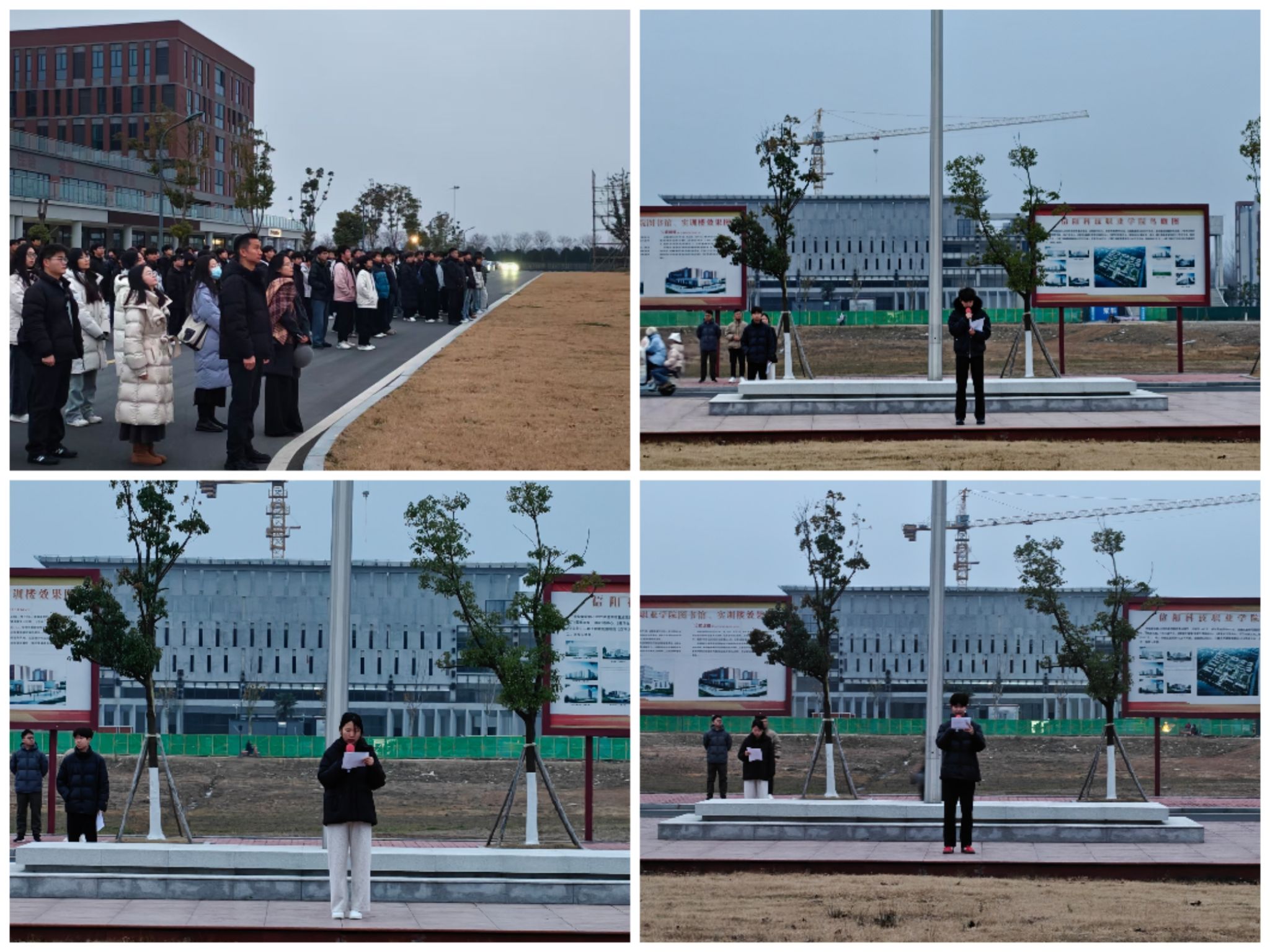 冬日的晨光中,国旗护卫队步伐铿锵,护卫着鲜艳的五星红旗入场。在激昂雄壮的《义勇军进行曲》中,全体师生肃立行礼,注视着国旗冉冉升起,迎风飘扬,共同感受这一庄严时刻所承载的爱国情怀与时代使命。